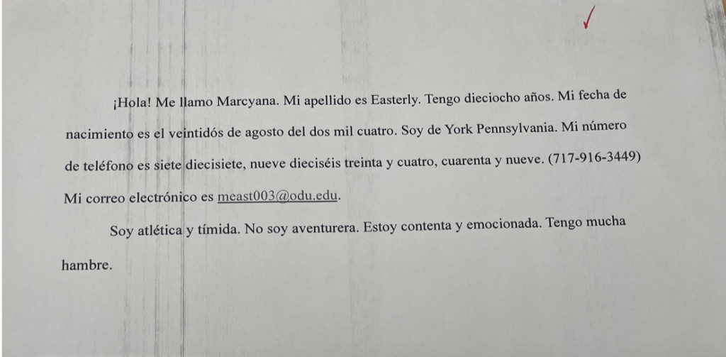 For our interpersonal communication activity we paired up with a partner and talked to them either in person or over zoom. In this activity we introduced ourselves to a classmate to practice our Spanish speaking. This activity really helped me understand how Spanish conversations go since they are very different from english conversations. The most difficult part of this conversation was figuring out the sentences and the proper way to say what I was trying to say. To overcame this I talked to my partner for help and if she did not know either or she wasn’t exactly sure if it was right then I asked Professor Padilla and then practiced the sentence over and over. I excelled at the pronunciation of the words because of how often I practiced my sentences.