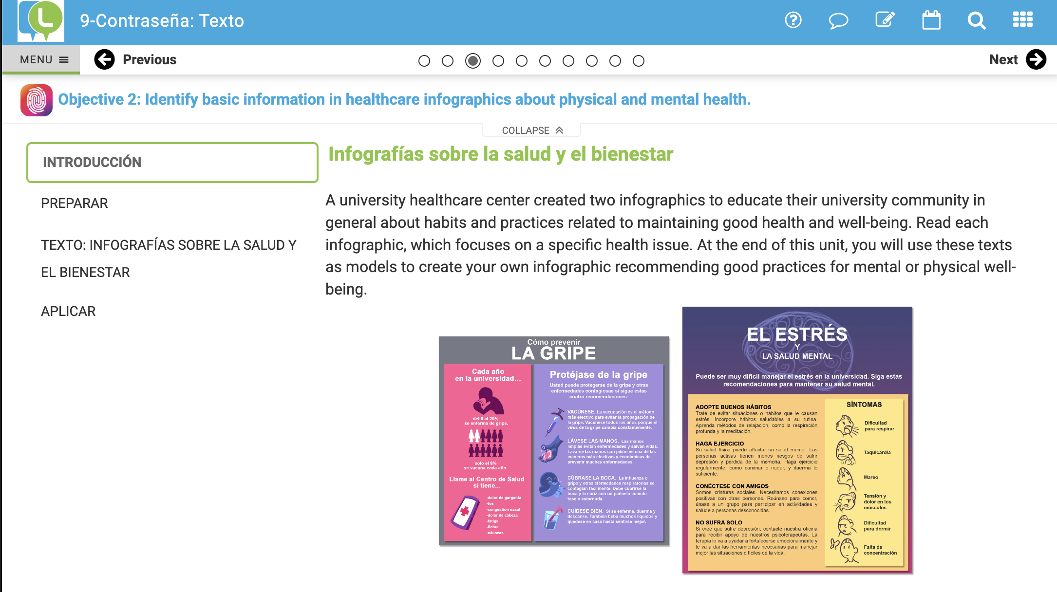 This reading had words and pictures on it so to me that was extra helpful. The reading taught us how to talk about different body parts, illnesses, and symptoms. It also taught us how to stay in good health. We learned to use formal commands to make recommendations on staying healthy. This reading was very interesting and useful for me because I am a nursing major.