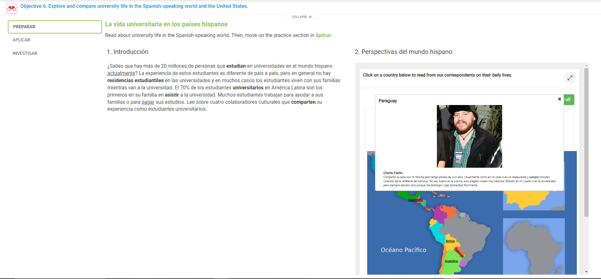 During the semester, our learning in class primarily consisted of listening to short 5 minute videos that demonstrated concepts and speech in Spanish. These also included additional side notes which further delved into what the video was talking about.