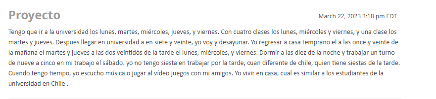 On our third project, we had to write down what our regular weekly schedule was in Spanish. We described what days of the week we did something and specified what times we did those things.