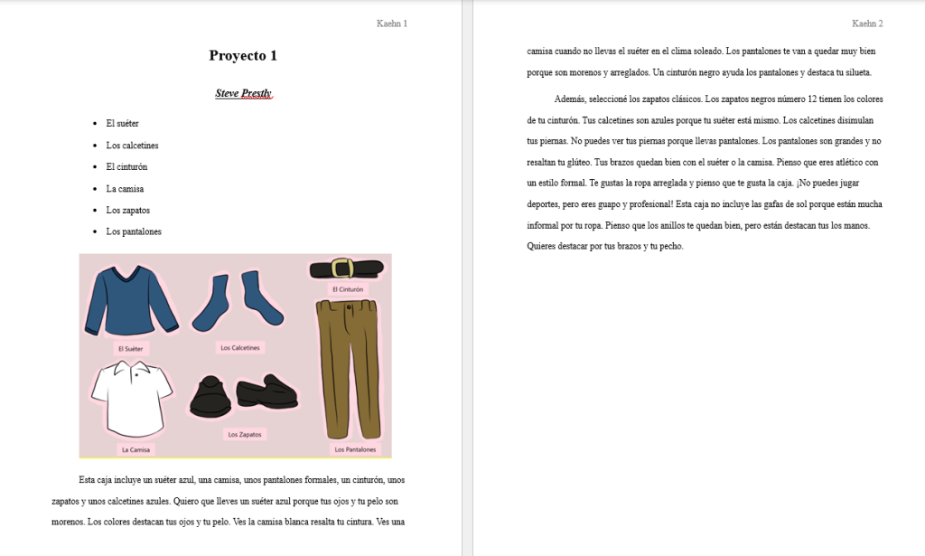 For our first project, I described what would look best on an individual I selected. We were meant to pick out a specific style and clothes to match that person. In doing so, we were to explain each article and work on proper grammar.