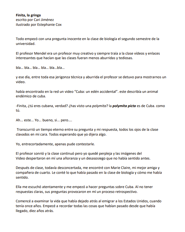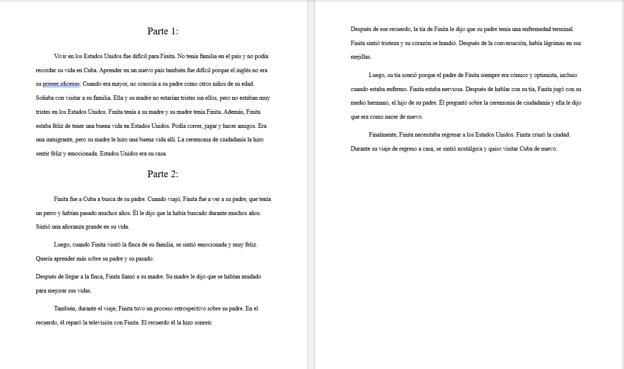 The stories I read made me realize how much of Spanish culture I am already familiar with. Artists such as Salvador Dali and Frida Kahlo are important to Spanish culture and the art world across cultural boundaries. As someone who enjoys art, I was thrilled to hear about these individuals in the Spanish context. I also was better able to understand the perspectives of immigrants and became exposed to reasonable expectations for helping them and promoting tolerance. Putting myself in the shoes of Finita really impacted my understanding the most as I had to think about things from her perspective to the fullest. Imagining her fear, sadness, and excitement as she processed how being an immigrant had changed her life in many ways.