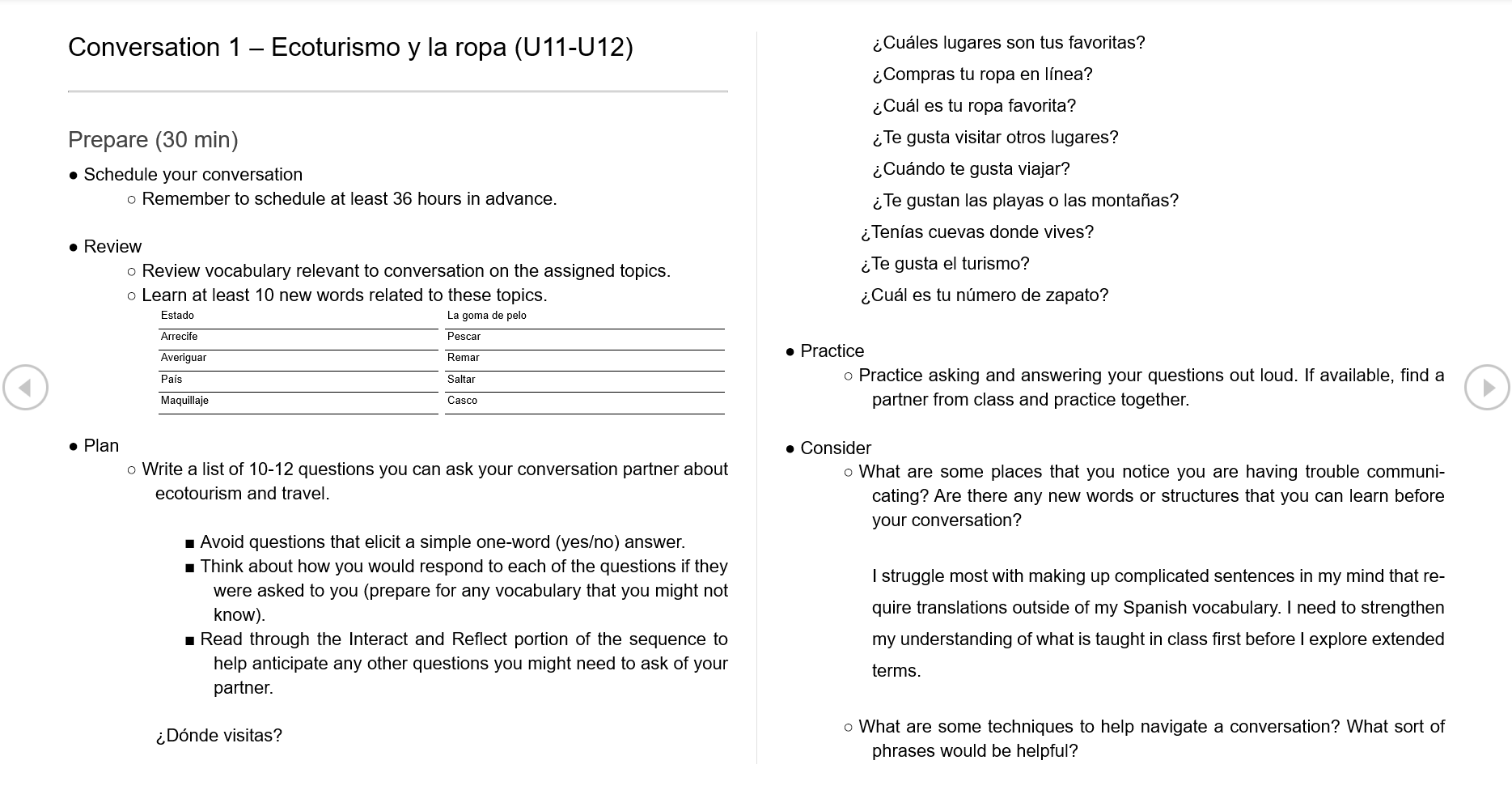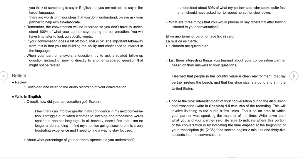 TalkAbroad was an excellent platform to use when practicing our oral Spanish skills. Our class also had group discussions and class participation, which required us to think on our feet to come up with answers when called upon. These activities helped me improve my ability to speak Spanish aloud.