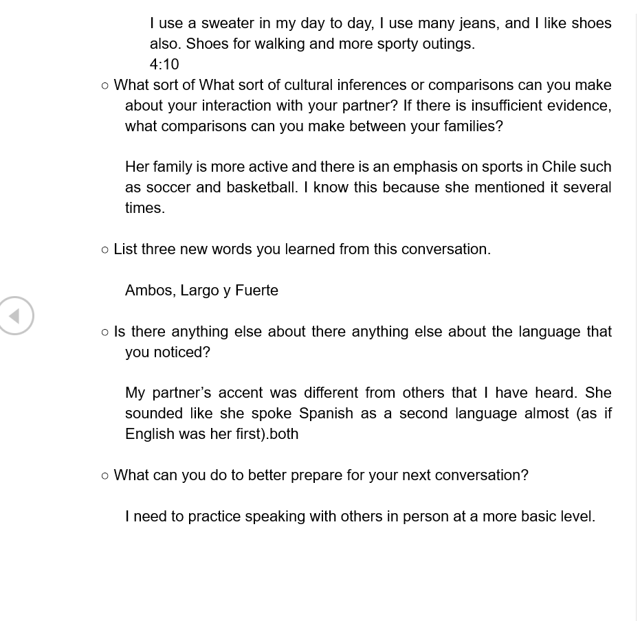 The artifact below is from a TalkAbroad activity I completed. I was meant to watch the video and interpret what was being said. The video had no captions, and I could not rewind or move backward when I needed/wanted to. This made it essential for me to focus and pay attention to the video the first time around so that I did not have to repeat it.