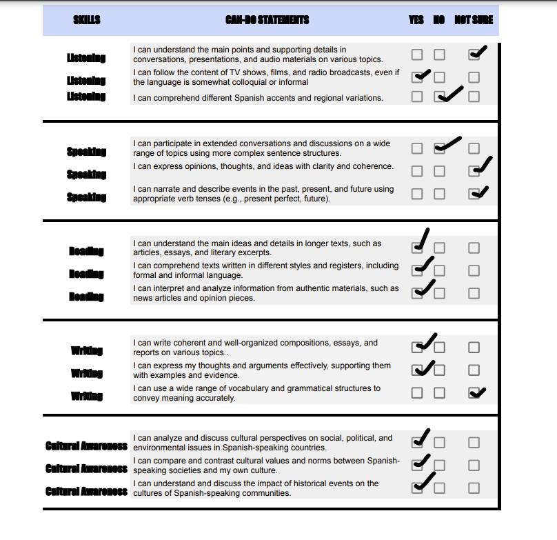 This is a self evaluation of your progress/proficiency. Next to each sentence provided, insert/place checkmark symbol to indicate what best describes your proficiency of that statement: “This is my goal”, “I can do this with help”, I can do this consistently”, “I have provided evidence to demonstrate this”. Proficiency levels may vary from one sentence to another. Each semester you will adjust the checkmarks to indicate your progress.