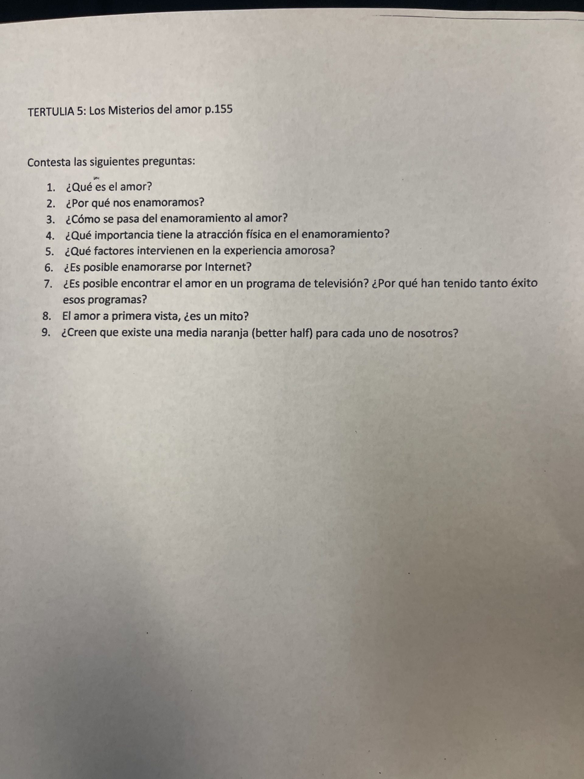 In this class we had assignments called “Tertulias” which were questions designed for class discussion. With these I was able to communicate my opinions on current social and political issues in my country and other countries. These conversations made me more comfortable in expressing myself and interpreting other opinions.