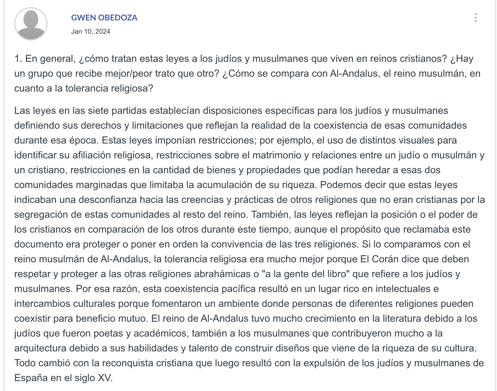 After every class lecture, we are assigned to answer analytical questions about the reading materials assigned for that day in order to check our understanding of the texts, and to share our perspective and opinions with the whole class. This is a way to evaluate what we have learned in lecture, while practicing our writing skills.