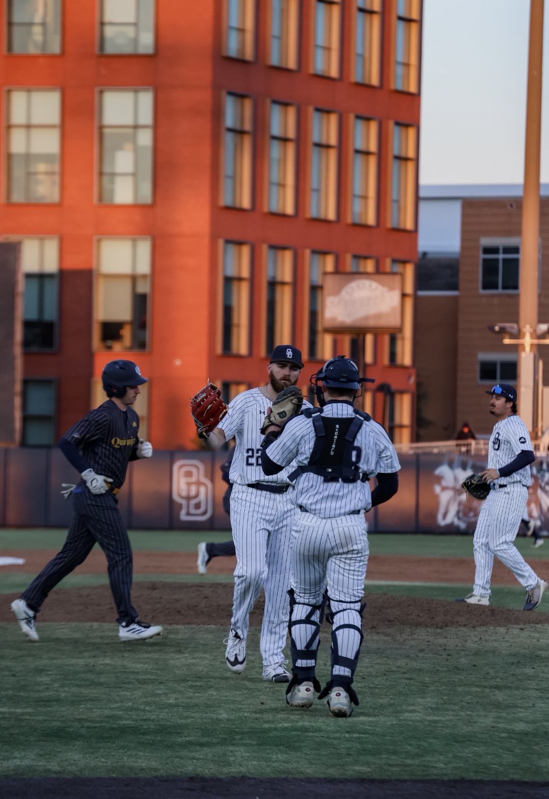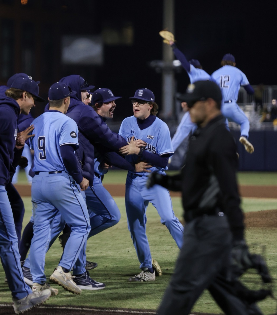 The ninth inning was probably the biggest part of that game. Charlie Pearce, a freshman, came in with the bases loaded and one out. That is not an easy situation for anyone, especially a freshman. But he stayed calm. When he got the final out, he pumped his arms toward our dugout and we all ran out to celebrate (in the photo below). It was his first collegiate save, and it secured the sweep.