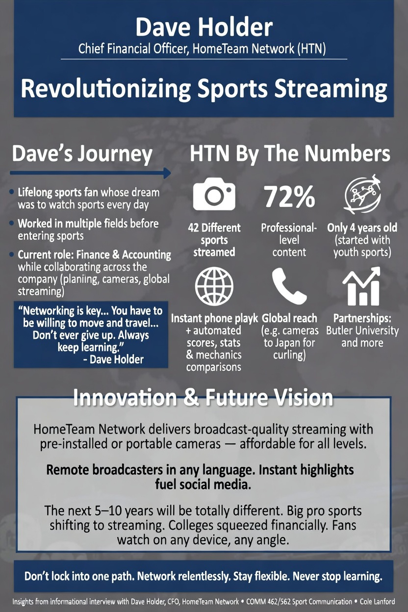 For my Professional Penpal Infographic assignment, I interviewed Dave Holder, Chief Financial Officer at HomeTeam Network (HTN). In only four years, HTN has grown from a youth sports streaming service into a company that delivers high quality streams for 42 sports, with 72% at the professional level. Dave shared his journey from a lifelong sports fan to his current role is overseeing finance while also coordinating cameras, planning, and global operations. He shined light towards HTN’s affordable technology, instant playback, and vision for a streaming-dominated future in sports media. His top advice, network relentlessly, stay flexible, and never stop learning, was something that will stay with me. The infographic below captures the best parts of his story and HTN’s industry changing approach.