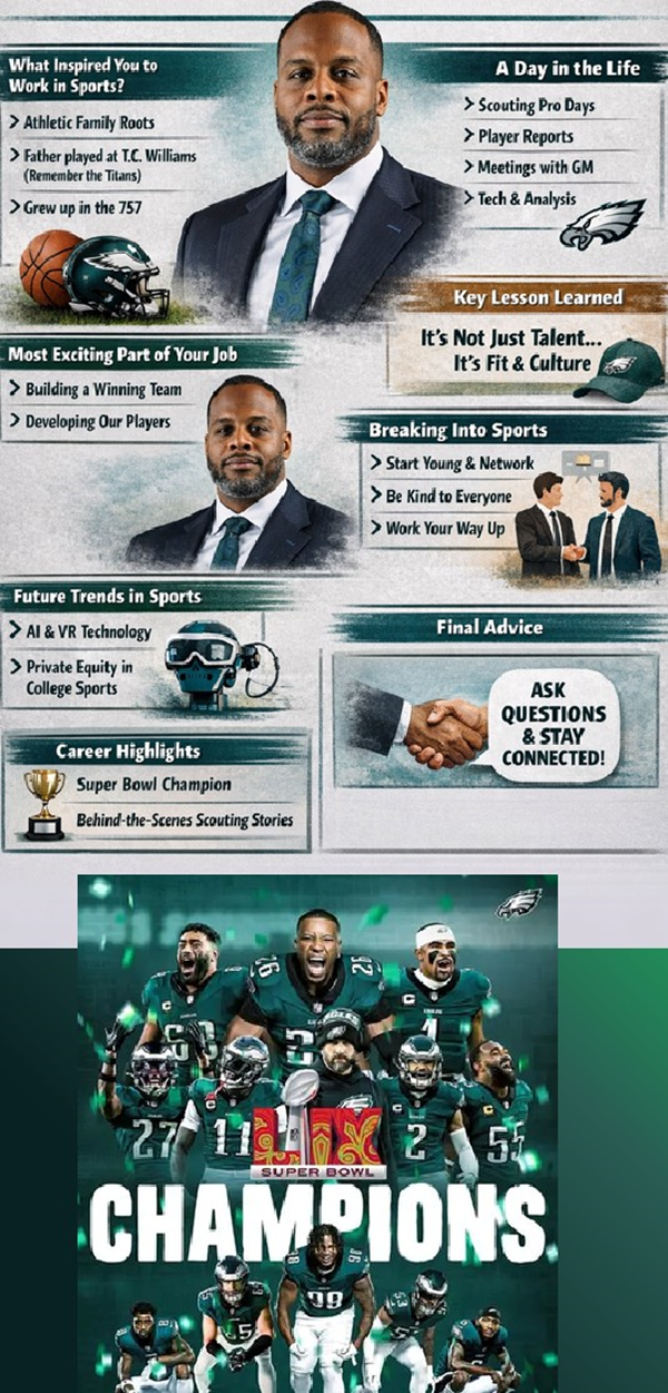 For my Don’t Be the Weakest LinkedIn assignment, I got the chance to interview Chuck Walls, Vice President of Player Engagement for the Philadelphia Eagles, and it honestly changed how I see careers in sports. Instead of a paper, I turned the interview into an infographic to make it more engaging and easier to follow.