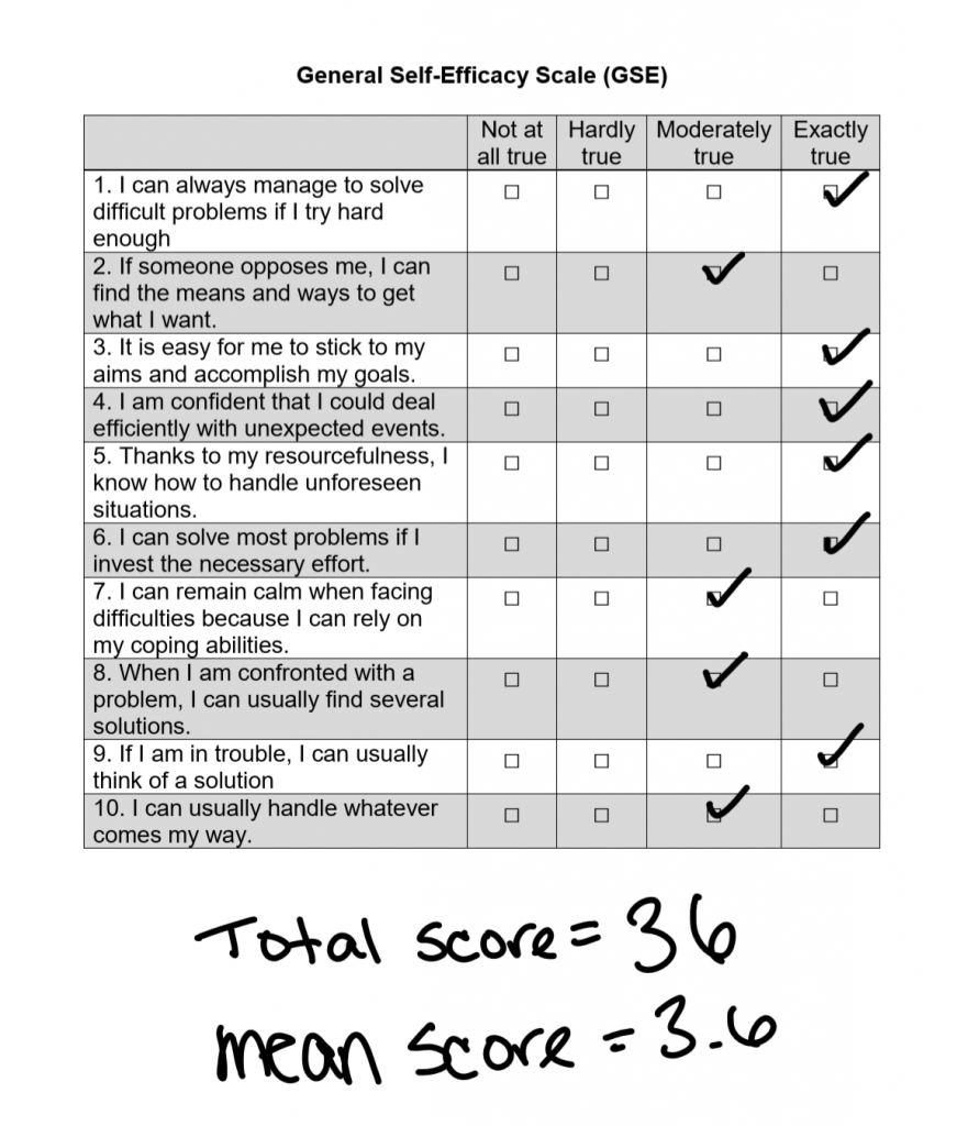 I believe this is a prefect example on why I answered the self-efficacy scale. The questions I answered “Exactly True” for made me think of relevant situations and how I handled them exactly how I needed to and succeeded. The questions I answered “Moderately True” for was due to situations where maybe I didn’t always handle them the best way but most of the time I did. I think my answers are a great example of how I handle situations and meet my goals. I believe myself to be very motivated and driven and I want to do everything and anything I can (within reason) to succeed.