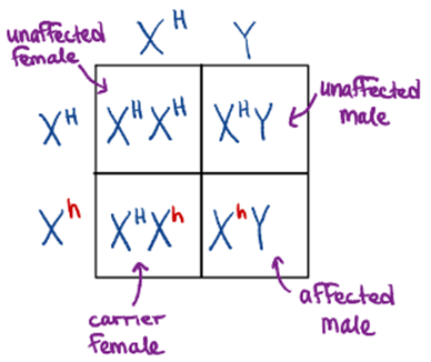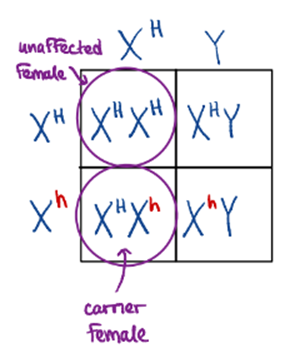 10. Using a Punnett square (again, draw a table or line up the genotypes), explain why only males in the pedigree chart have hemophilia. Only males can have the hemophilia disorder because they have only a single X chromosome; therefore, there is a 50% chance of them receiving the disorder. Men only have one X and one Y chromosome. Women have two X chromosomes. As a result, if a woman has the recessive Hemophilia X chromosome, they can only become a carrier with the other non-affected X chromosome that they have.
