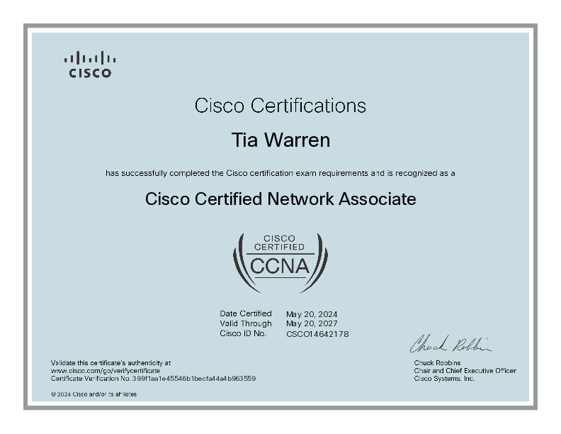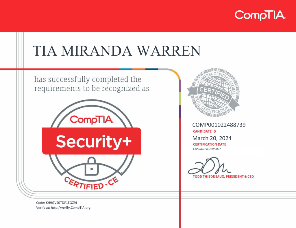 I am Tia Warren, an aspiring cybersecurity major set to graduate in 2028. I have had a deep interest in technology and cybersecurity since I was a middle schooler and am eager to apply my skills and knowledge to learn even more about the field and reach greater heights. I have cursory knowledge about cybersecurity, especially when it comes to networking topics and techniques.