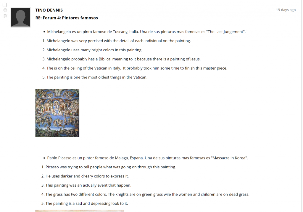 We had many different discussion board assignments. We had to look up painters. It was amazing that many of the famous Spanish painters had pretty well-known art. I thought this was an interpersonal communication that I had in this class.