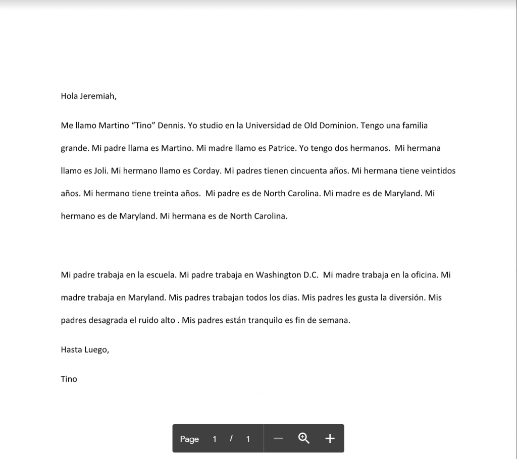 We did do some writing assignments. One of the assignments was we had to write a letter. We wrote a letter talking about our family to one of our friends. This was one of the writing assignments was presentational writing.