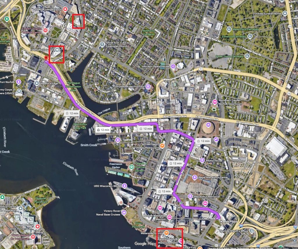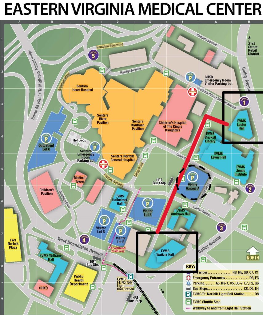 From the Sheraton, go to the Civic Plaza Station. Take The Tide Light Rail to the EVMC/Fort Norfolk Station.